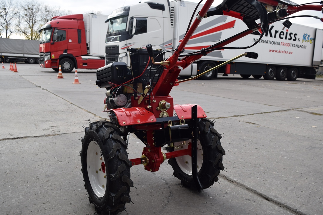 Топливодизель Мощность двигателя, л.с.6 Охлаждение двигателявоздушное, принудительное Запуск двигателяэлектростартер, механический ручной Передачи вперед3 Разблокировка дифференциаланет В комплектефреза + рычаг упора + колеса
