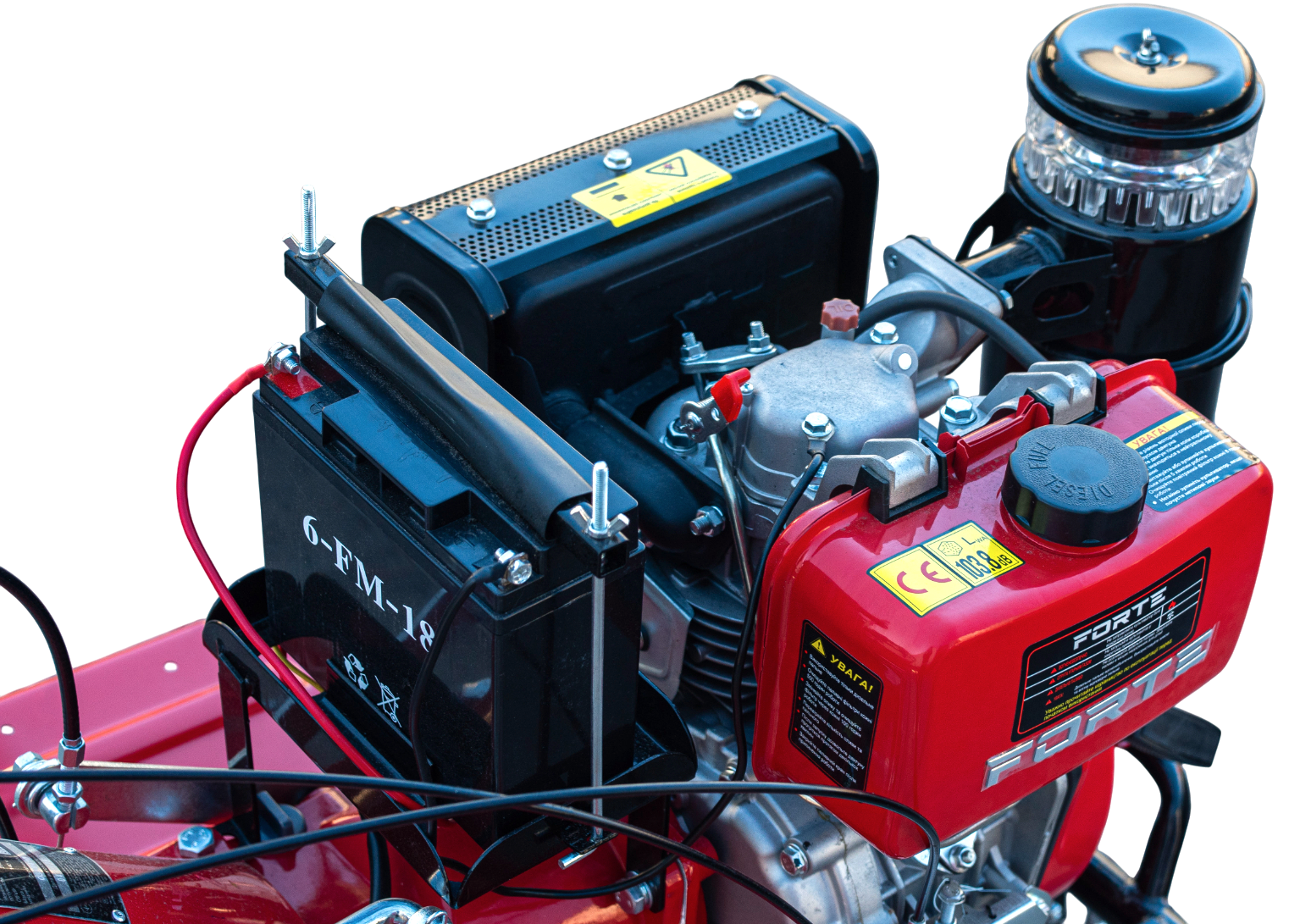 Техніка Forte 1050E 10 "оснащується двигуном марки 178f і має потужність 6.5 кінських сил. Обсяг двигуна становить 296 кубічних сантиметрів, і він може розвивати обороти до 3600 в хвилину. Охолодження - примусове повітряне, а система запуску обеспечи ается за допомогою ручних органів управління або електростартером. Споживає палива апарат 285 грам на годину, а також на корпусі розміщується бак для дозаправки об'ємом 3.6 л.