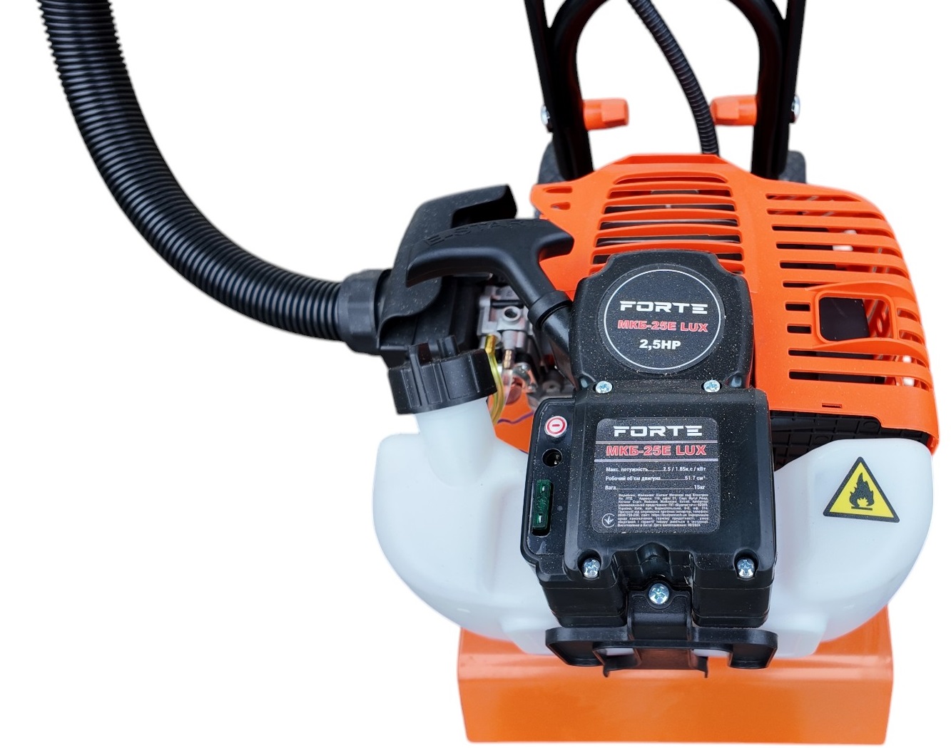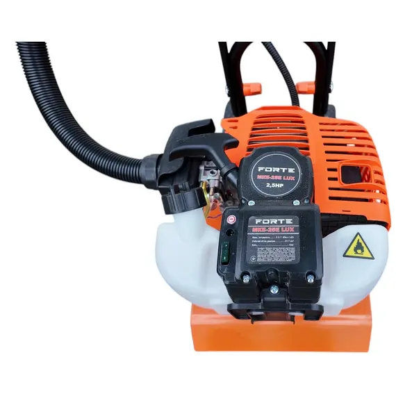 Мотокультиватор Форте МКБ-25 LUX як рушійний елемент використовує двотактний бензиновий одноциліндровий двигун з об'ємом 51,7 см3. Примусова система охолодження не дасть перегріватися мотору, під час виконання тривалих робіт. Для зручності управління Forte МКБ-25 LUX, розмістив всі органи управління на рукоятці, це забезпечило зручність контролю під час обробки.