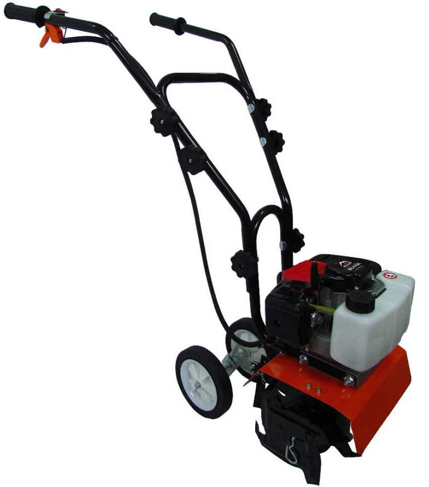 - Два транспортувальних колеса на мінікультиватор полегшать вам управління при обробці землі, дозволять легко перекочувати до місця роботи або місця зберігання;